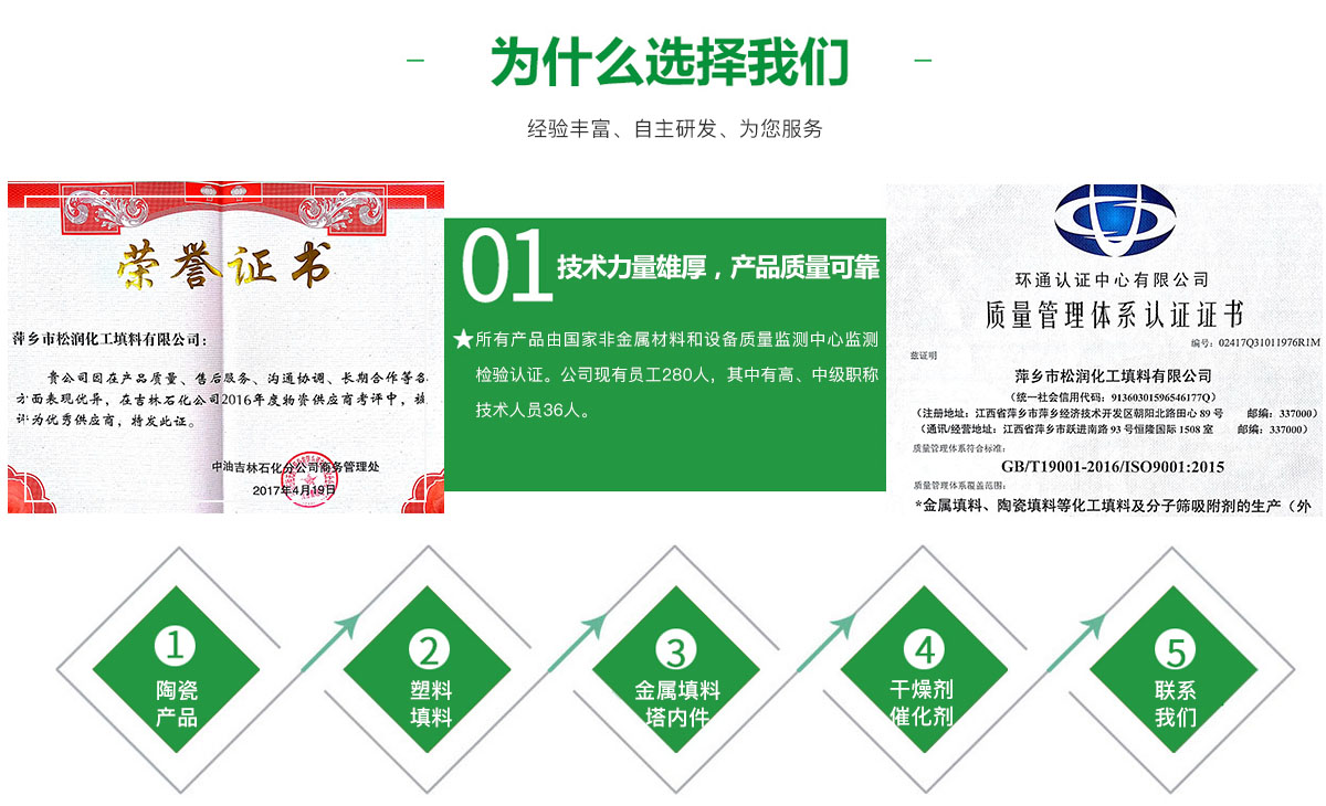 萍鄉市松潤化工填料有限公司位于江西省萍鄉市國家經濟開發(fā)區西區,是專業生產、經營陶瓷、聚丙烯、金屬填料、塔內件、水處理濾板、濾管、濾料、瓷球、分子篩、催化劑、活性炭、蜂窩陶瓷、瓷質耐磨托輥等系列產品的民營企業。所有產品由國家非金屬材料和設備質量監(jiān)測中心監(jiān)測檢驗認證。公司現有員工280人,其中有高、中級職稱技術人員36人。工藝先進,技術力量雄厚,產品質量可靠,配...